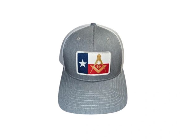Snapback adjustable baseball cap hat with a patch depicting the Texas Flag and a Square and Compass.