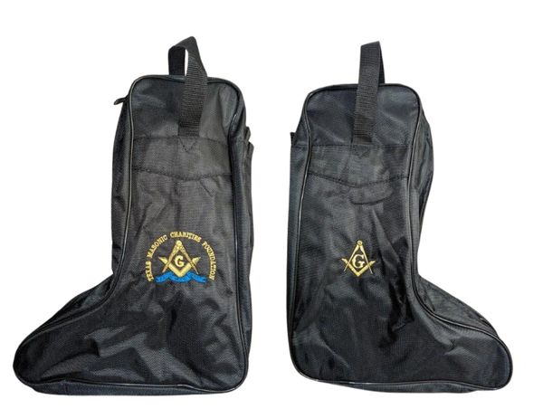 Black canvas boot bag carrying case with TxMCF and Square and compass on one side and on the other is a Square and Compass.
