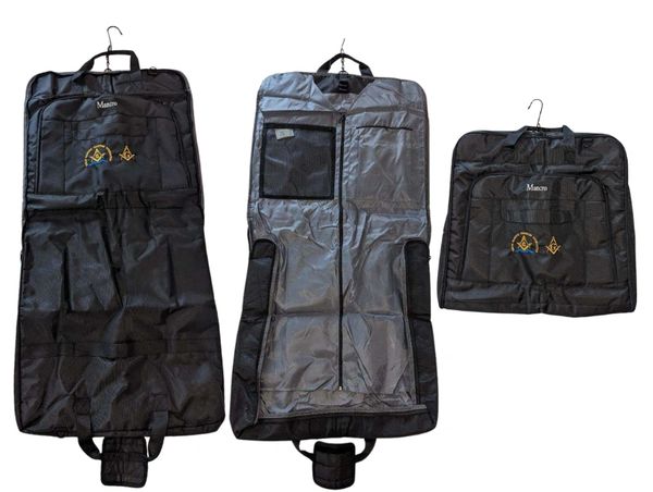 Black canvas garment bag carrying case with TxMCF and Square and compass on one side and on the other is a Square and Compass.