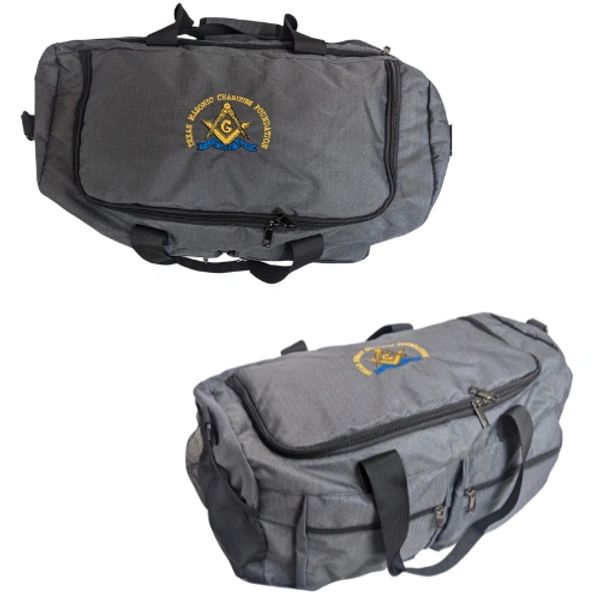 Dark grey duffle bag with TxMCF and Square and compass on top.